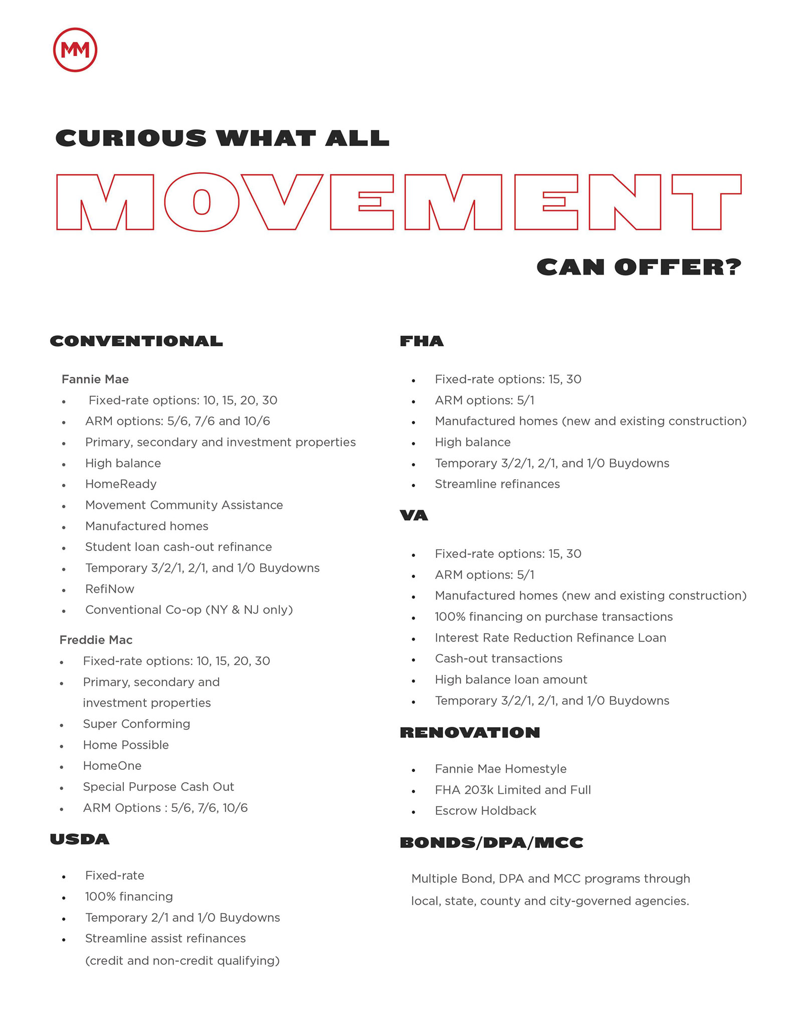 | FHA | For both non-first-home buyers and first-home buyers with lower credit scores and down payments, backed by the Federal Housing Administration. | 1-4 Unit (primary residence)