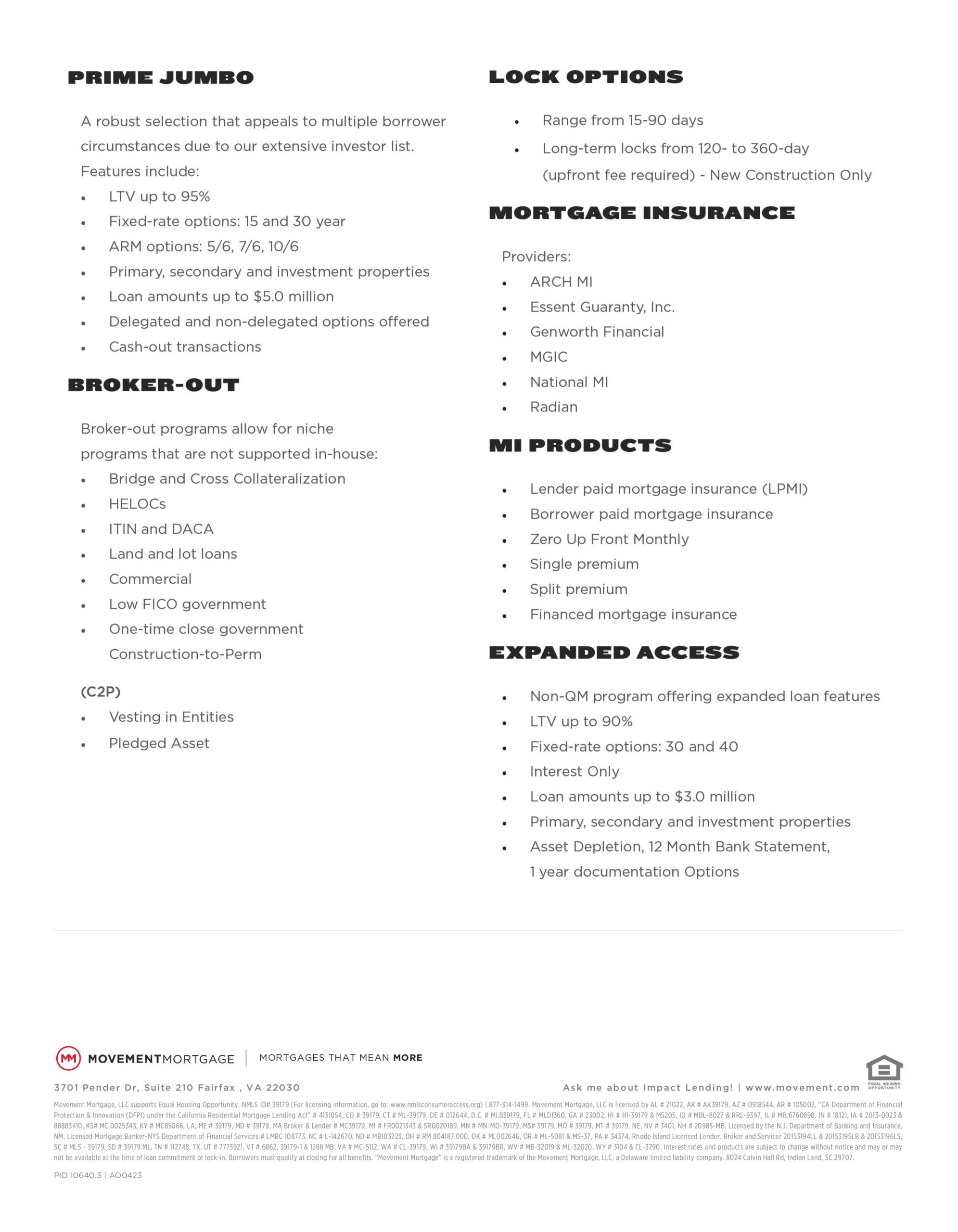| Standard Conventional (no MI) | Conventional loan products for buyers putting 20% down may prevent the addition of mortgage insurance on the loan | 1-4 Unit (primary or investment homes)